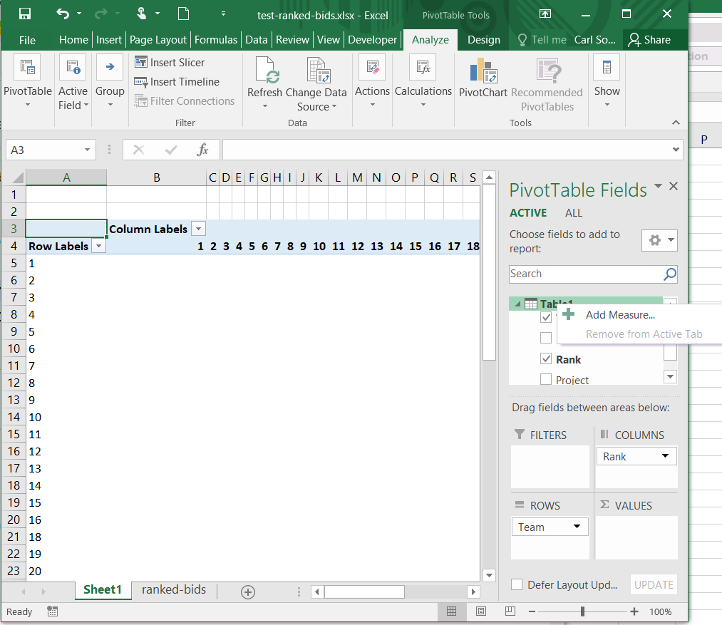 7. If the data to be placed in the Values area is text (like NetID), you will need to create a new Measure for that data, as follows: