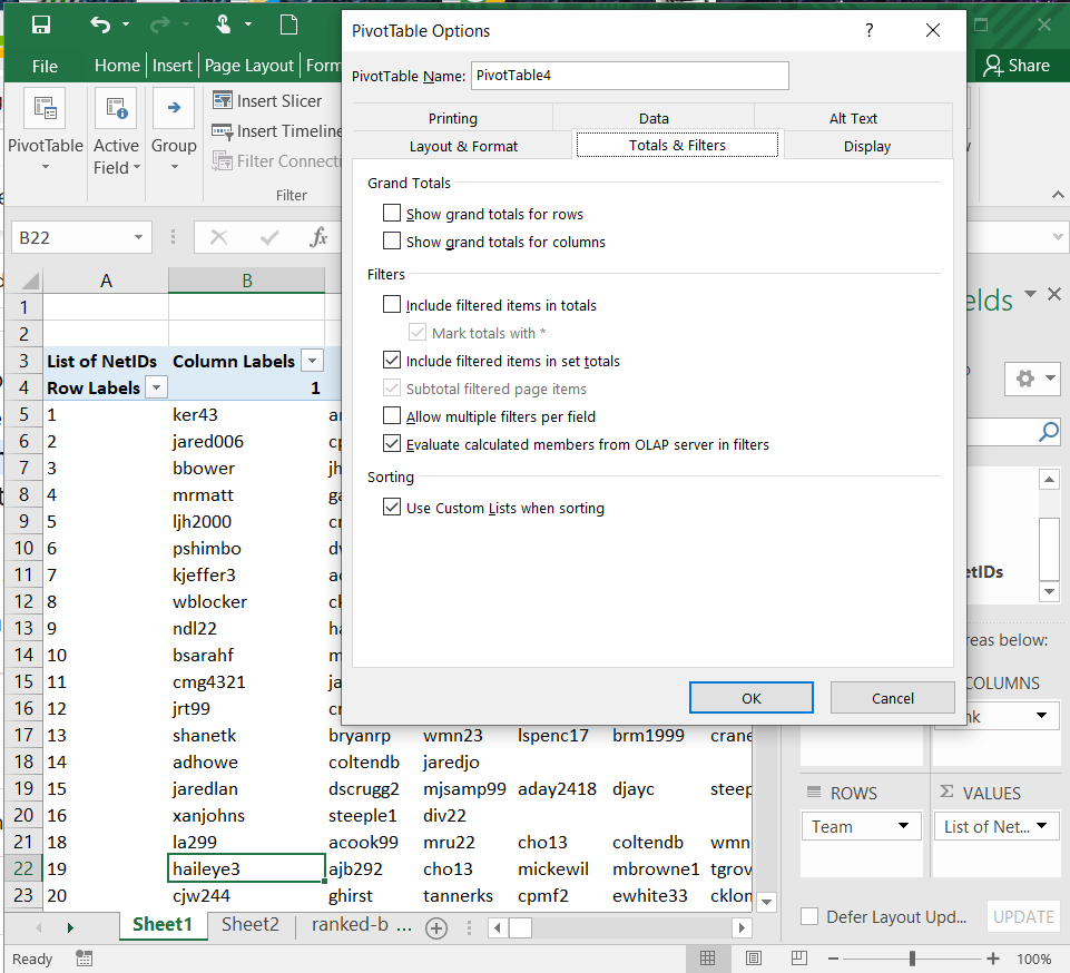 5. Turn off the row and column totals by selecting Pivot Table, Options, then the Totals & Filters tab, and clearing the Show grand totals for rows and Show grand totals for columns checkboxes. Then click OK