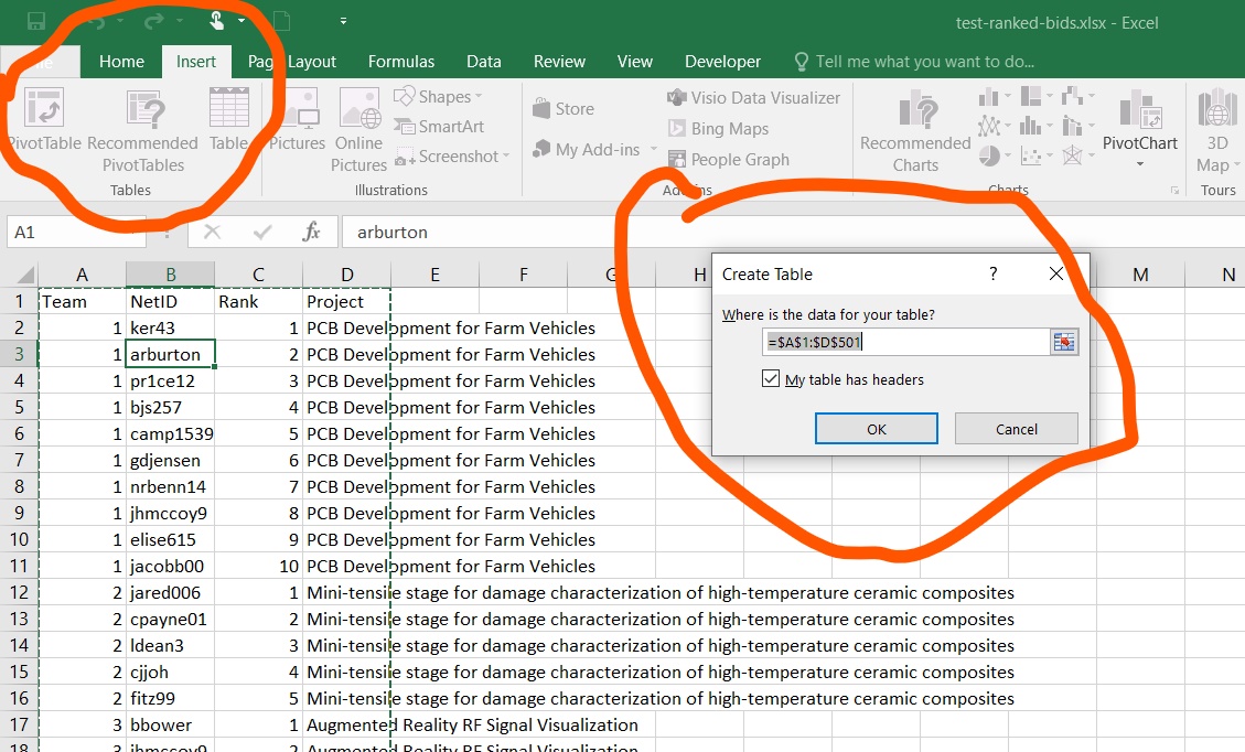 3. Click somewhere in the data list in the file. From the Insert menu, select Table. In the popup window, make sure the proper data is selected, and the “My table has headers” box is checked. Click OK.