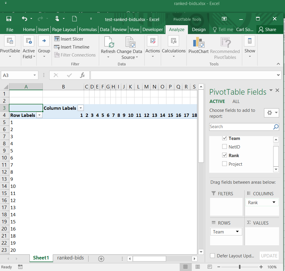5. The new sheet in which the Pivot Table is created will become the active sheet. On the right hand side of the sheet is a window showing the pivot table fields. Click on the name of the field that should be the row labels (not the check box) and drag it to the Rows window. Do the same for the field that should be the column labels.