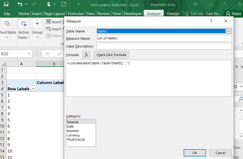 7. If the data to be placed in the Values area is text (like NetID), you will need to create a new Measure for that data, as follows: