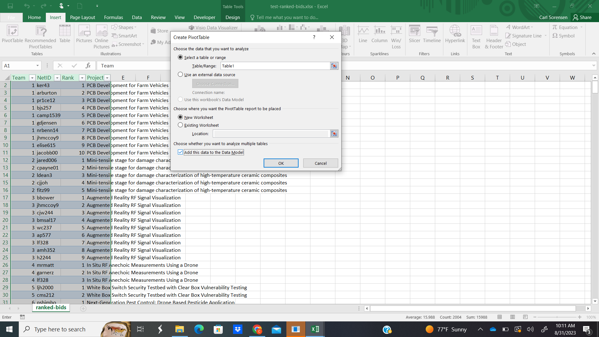 4. From the Insert menu, select Pivot Table. In the popup window, make sure you have the “Select a table or range” option button checked, and the table should be Table1 (the newly created table from the previous step. Make sure the “New Worksheet” option button is selected. Make sure the “Add the data to the Data Model” checkbox is checked. Click OK.