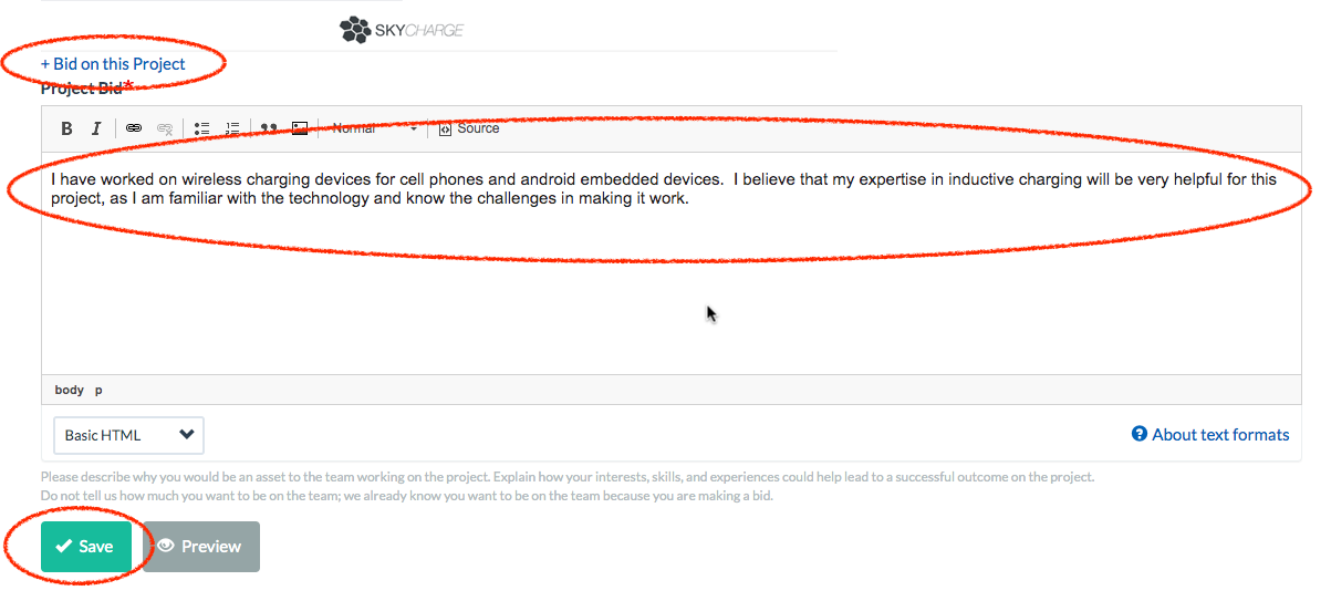 2. Enter the reasons why you think you would be great for this project in the Project Bid window.