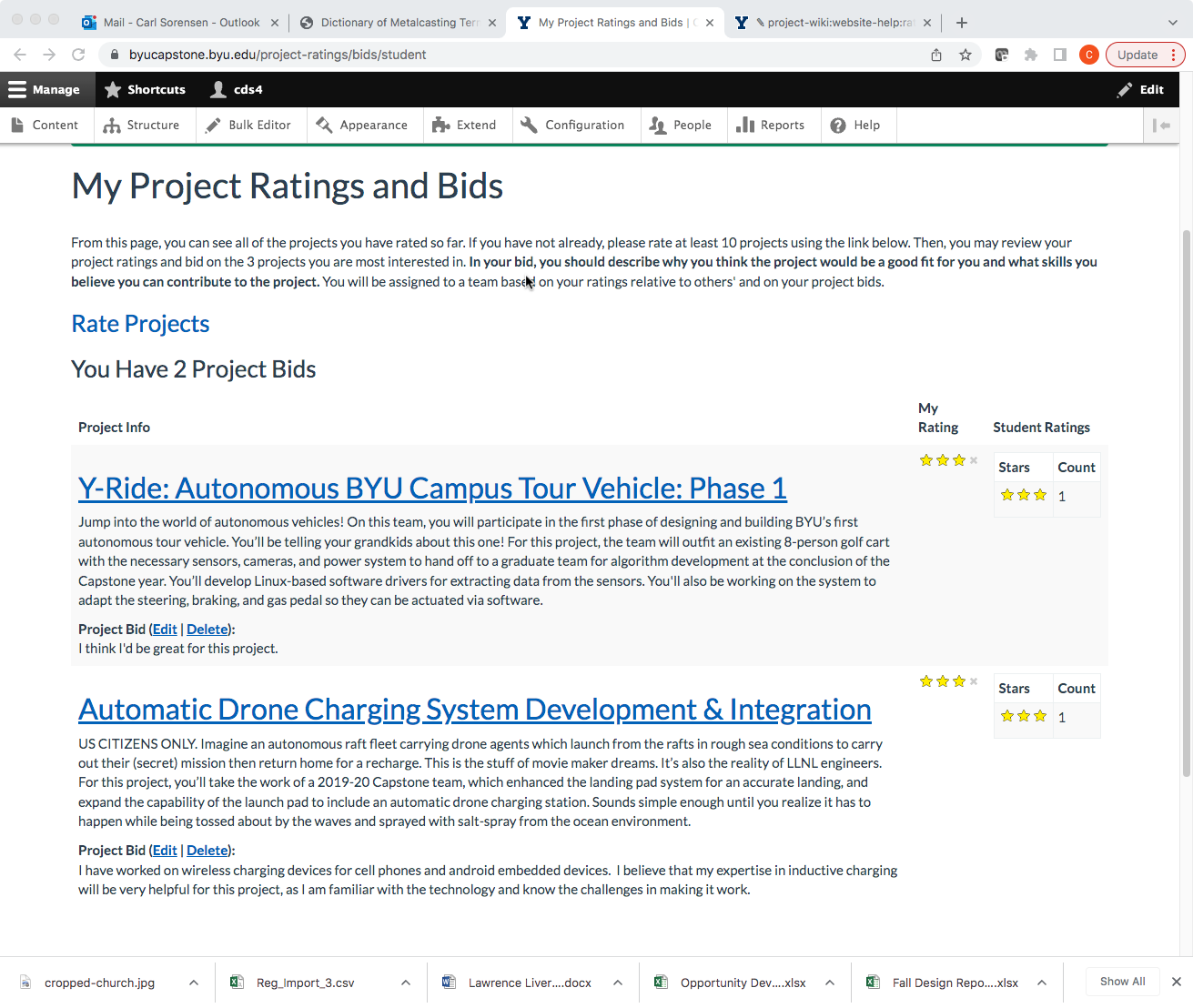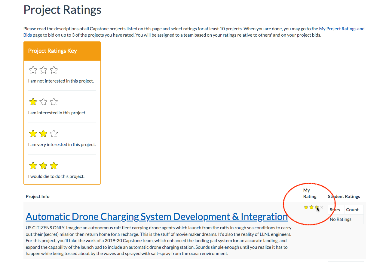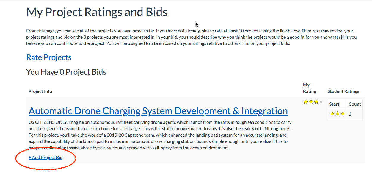 You may bid on a maximum of 3 projects that you have rated as 3-star projects. (To “bid” on a project simply means you can add a comment to a specific project that includes your reason for wanting to be part of the team for that project. This might include previous experience, specific professional goals, pertinent completed coursework, etc). You must rate the projects before you can bid on them. Project bids are considered by the Capstone instructors when forming teams.